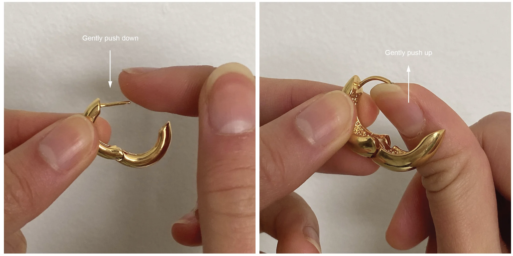 If you encounter these issues, it’s unlikely your earrings are faulty. However, to avoid losing them, please stop wearing them immediately and follow these steps to adjust your hoops or earrings: